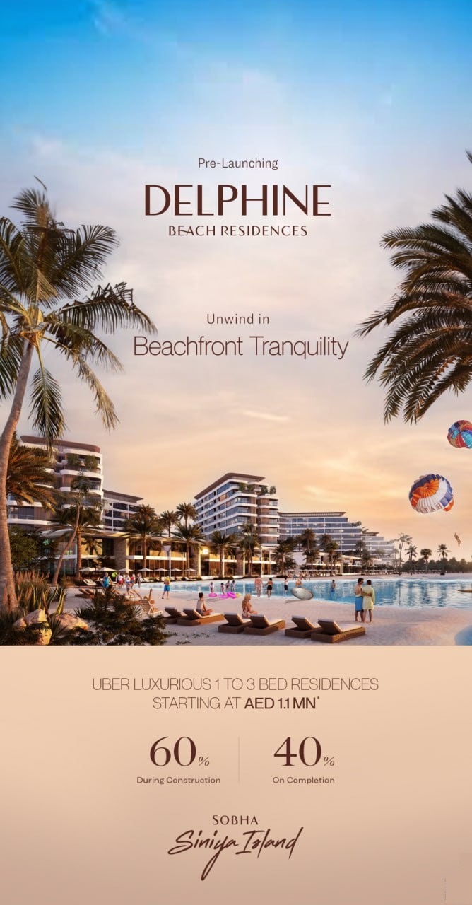 Delphine Beach Residences at Siniya Island is the latest waterfront development by Sobha Group featuring exclusive designed 1, 2 and 3 bedroom apartments within Umm Al Quwain. Discover untouched paradise with unique blend of natural beauty and luxurious living, nestled on the pristine shores of the Island. The exclusive class three tower façade offers a lifestyle, where serenity meets sophistication, and every moment is an opportunity to reconnected with nature, while enjoying the pinnacle of comfort and elegance. Imagine waking up to panoramic waterfront views, the gentle lapping of waves, and the mangroves, all just steps away from your front door.
