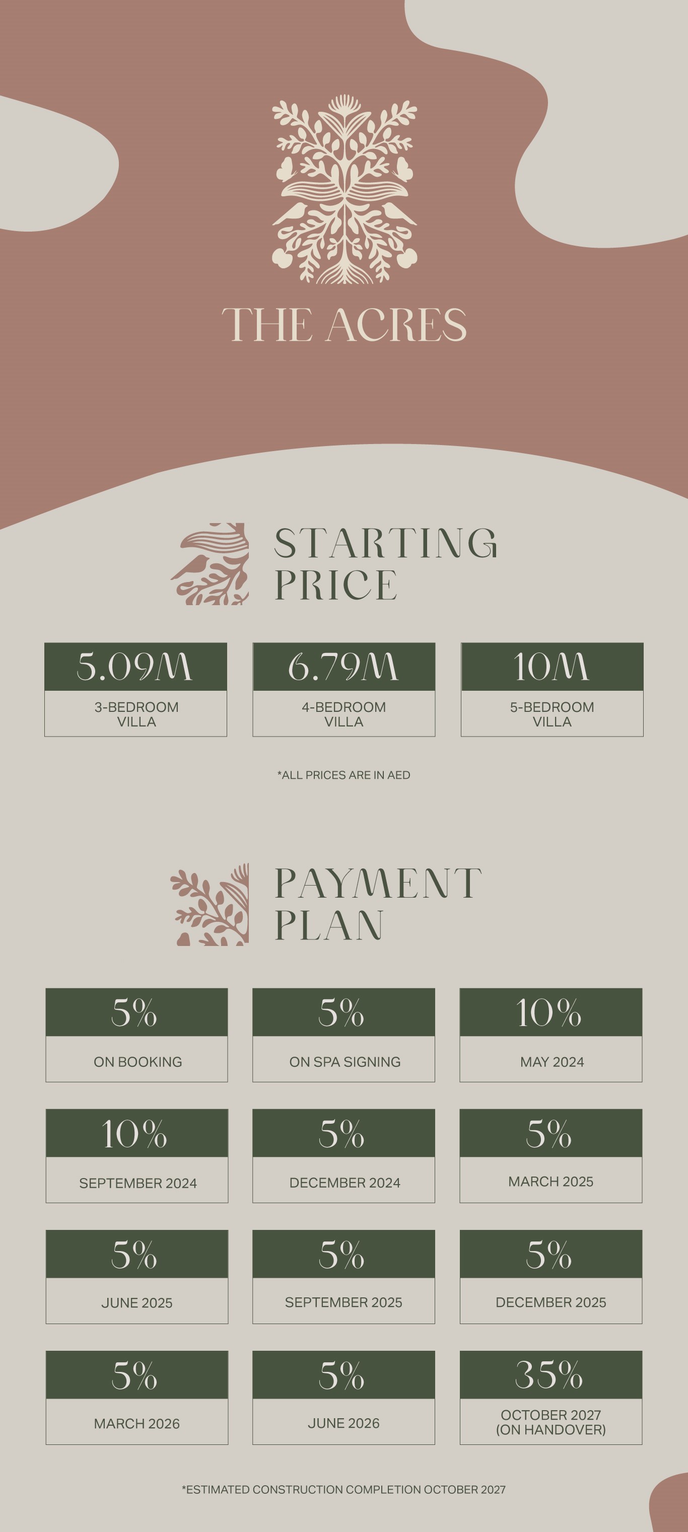 The Acres Estates Phase 3 by Meraas welcomes you to a world of unparalleled luxury at the well-known destination of Dubailand lined with premium 5, 6 & 7-bedroom villas. This outstanding development features a luxurious high-end façade created to give a new meaning to contemporary living. Where nature and luxury blend perfectly into a haven of sheer elegance and serenity, this enclave makes its presence a perfect blend between architectural marvel and serene landscape. Each villa exudes opulence, with expansive living spaces, flowing indoor-outdoor areas and the highest selection finishes, acquired for all motion of the globe accomplished homeowners. Situated in one of Dubai’s most desired locations in Dubailand, it offers an exclusive chance to be the owner of a house that embodies poise and peace. Two distinct villa collections, Ivory and Amber have been masterfully crafted flawlessly to offer different design features that bring natural appeal. Open glass facades, wooden trim and details of stone give a classic image, helping every house smoothly to an environmental scene. The premium interiors enhance living experiences with comfortable room layout, and functionality at ease. A smooth experience in nature is what embodies the heart of this community, where walkable tree lines, swimmable ponds and lush green gardens give a floral escape from city life. Residents can unwind in exclusive outdoor spaces, take in panoramic views of their outdoor space or, allow themselves to soak in the serene atmosphere. Be it, strolling through carbuncular pathways, leveraging recreational stays or merely, sensing the serenity of nature, every second here is crafted to create a profound feeling of well-being.